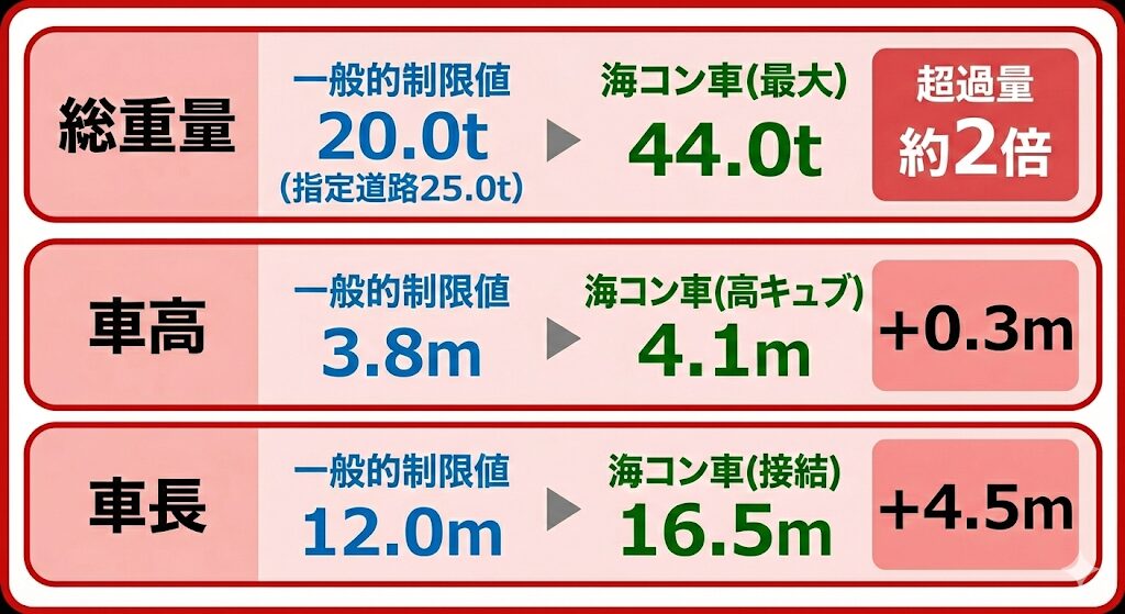 日本の道路には、構造を守るための「一般的制限値」というサイズと重さの基本ルールがあります。しかし、40ft海上コンテナを積載した車両は、以下の通りほぼ全ての項目でその制限を大幅に超過しています。