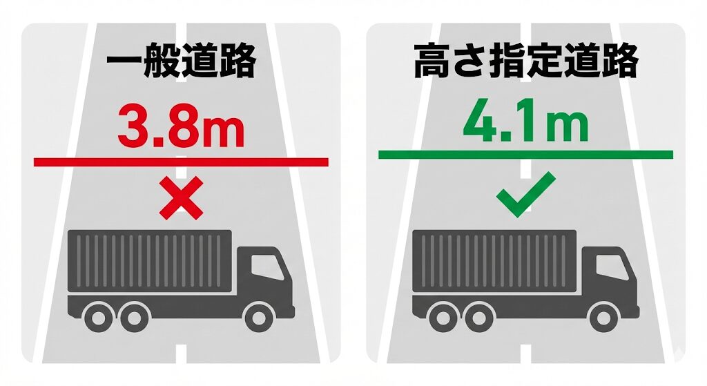 ここで重要なのが、高さ指定道路の存在です。一般的制限値は3.8mですが、道路管理者が構造上問題ないと認めた「高さ指定道路」では、4.1mまでの車両が走行可能です。