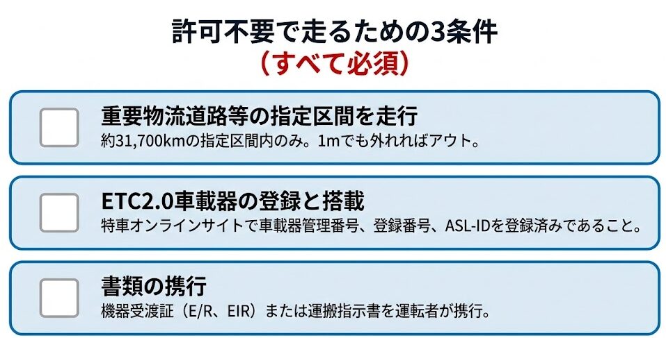 「重要物流道路を通るから許可は不要」——この認識には注意が必要です。確かに約31,700kmの指定区間では審査待ち約30日が不要になりますが、3つの絶対条件を一つでも欠けば、コンプライアンス上の重大なリスク(無許可走行)を抱えることになります。