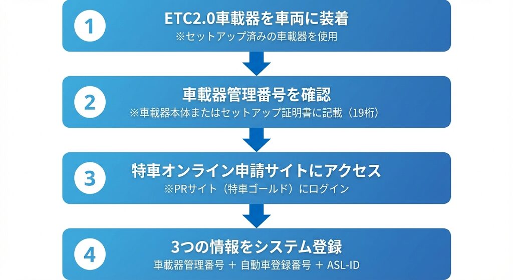 ここが最大の落とし穴です。単にETC2.0車載器を車に付けているだけではダメで、以下の手順で国に情報を登録する必要があります。