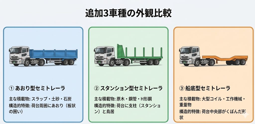 追加3車種(あおり型・スタンション型・船底型)は、平成27年に実務の実態に合わせて追加された特例車種です。前編の特例5車種と合わせて「特例8車種」と呼ばれ、総重量・高さ・駆動軸重・全長に緩和が適用されます。
