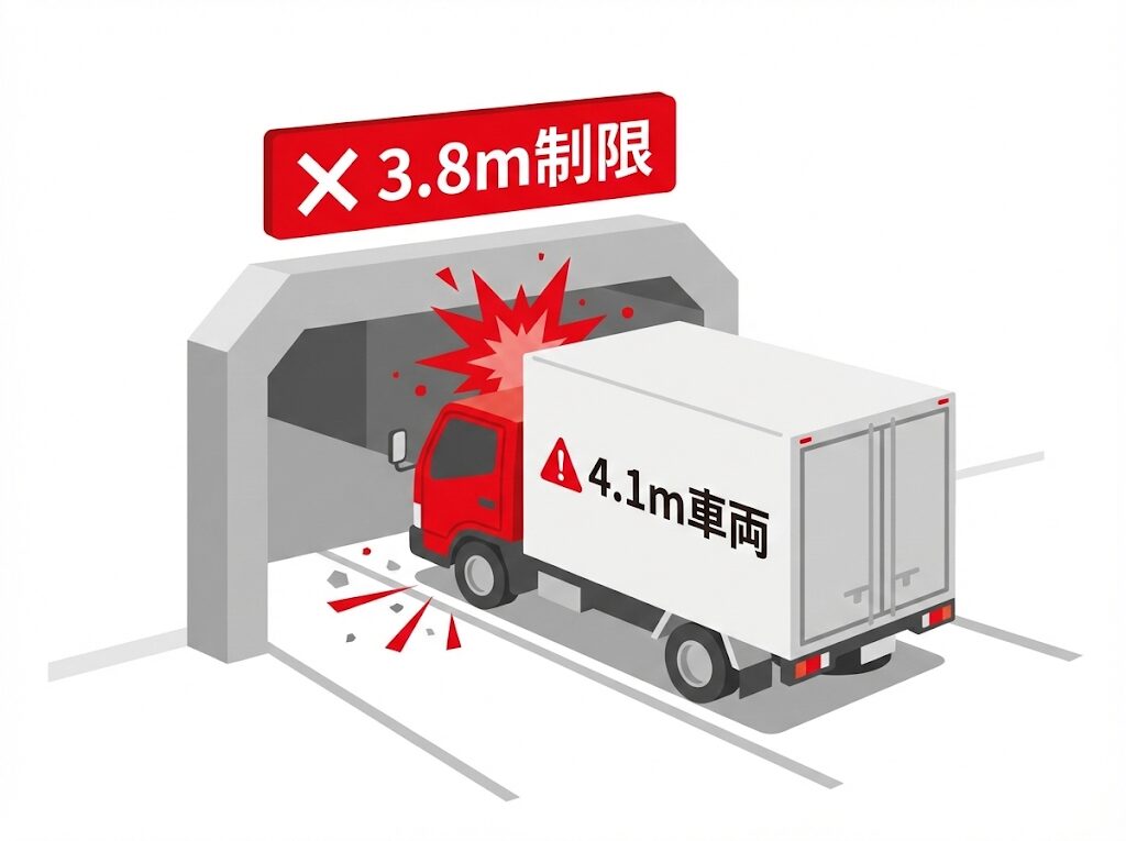 高さ指定されていない道路(特に古いガード下やトンネル)に4.1mの車両で進入すると、天井や桁に衝突し、以下のような事態を招きます。