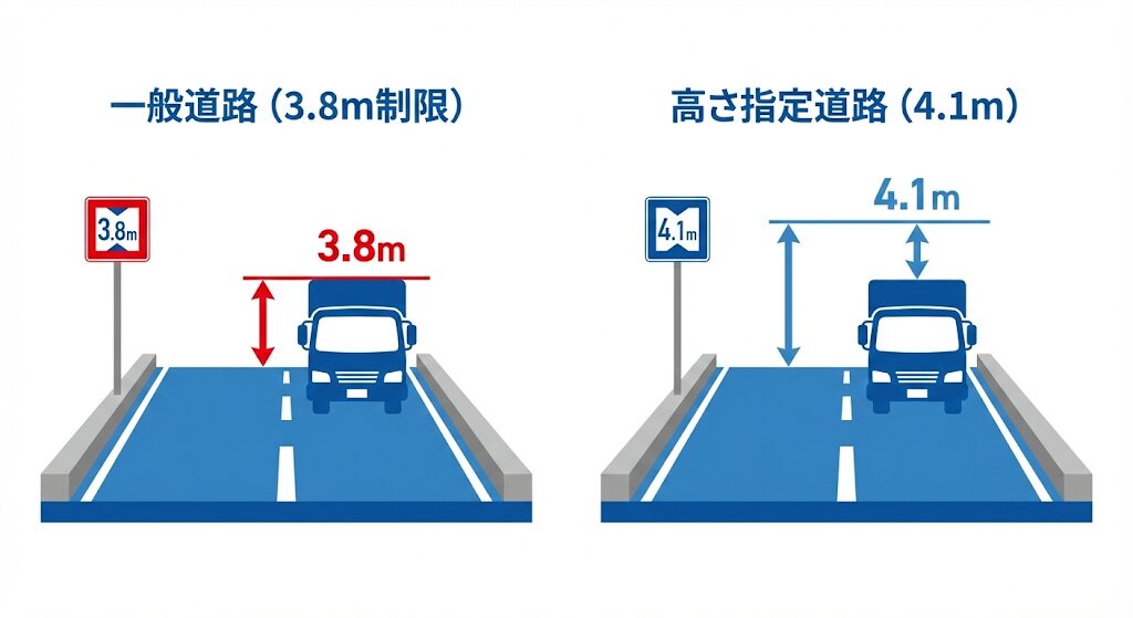 高さ指定道路(4.1m)は、物流効率化のための重要なインフラですが「指定された道を一歩でも外れると3.8m制限に戻る」という原則を忘れてはいけません。