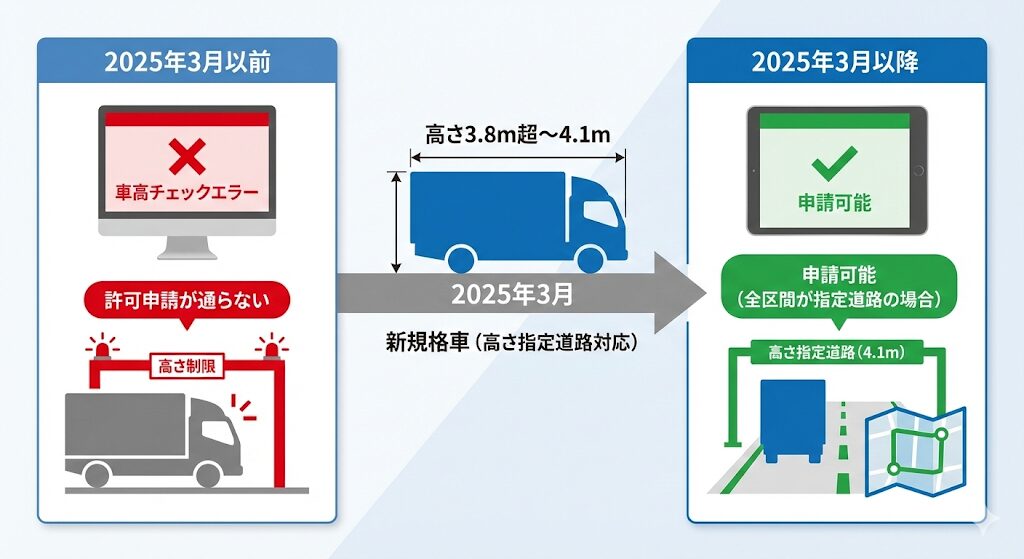 2025年3月のシステム改修により、以下の条件を満たす場合、新規格車でも高さ4.1mまでの申請が可能になりました。