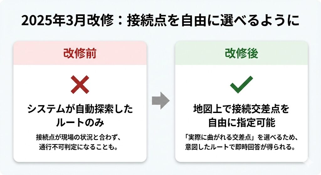 2025年3月のシステム改修では、ダブル連結トラックの即時確認対応に加え、ラストワンマイルと重要物流道路の接続点を自由に指定できる機能が追加されました。これにより、これまで未収録道路が壁となっていたケースでも、適切な接続点を選ぶことで即時回答が得られる可能性が広がっています。