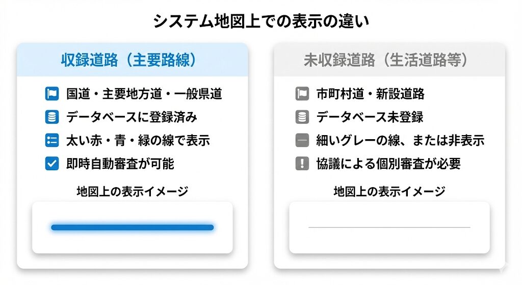 市町村道や、新しく開通したばかりの道路。地図上では「グレーの細い線」で表示されるか、線すら表示されないこともあります。データベースに情報がないため、自動審査ができず、道路管理者が図面を見て判断する「個別審査」が必要になります。