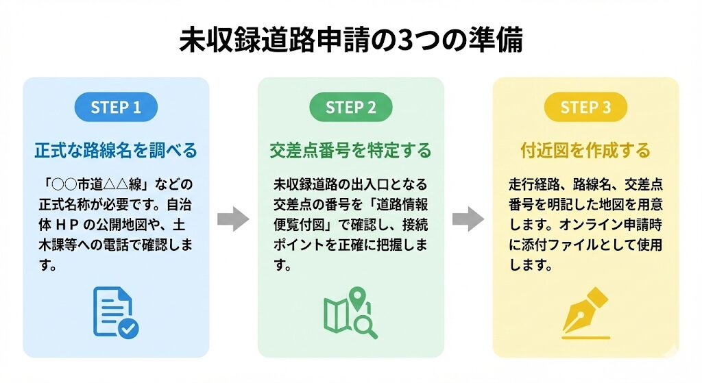 「道路情報便覧付図表示システム」などで確認し、申請書に記入する必要があります。つまり、「どの交差点から未収録道路に入るか」を特定する作業です。