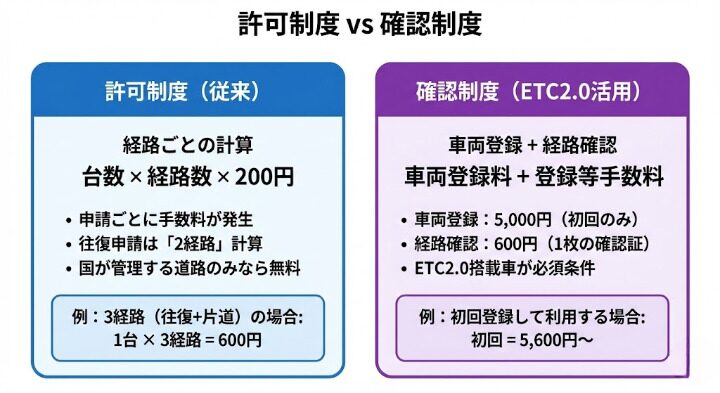 確認制度を利用する場合、たとえ1回しか走らなくても、最初に車両登録料として5,000円がかかります。従来の「1経路200円」とは異なる料金体系であることを理解しておく必要があります。