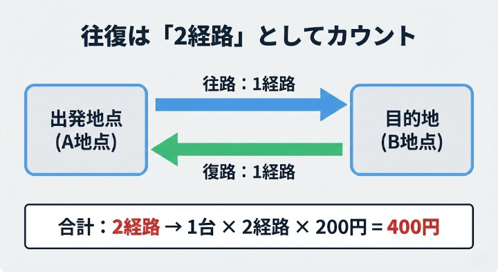 - 1台・往復1件 = 1台 × 2経路 × 200円 = 400円