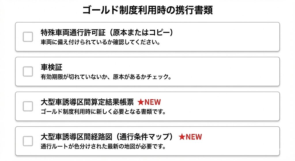 ゴールド制度で経路選択が自由になる分、携行書類の義務が厳格です。通常の許可証に加え、以下の書類を必ずドライバーに携行させてください。