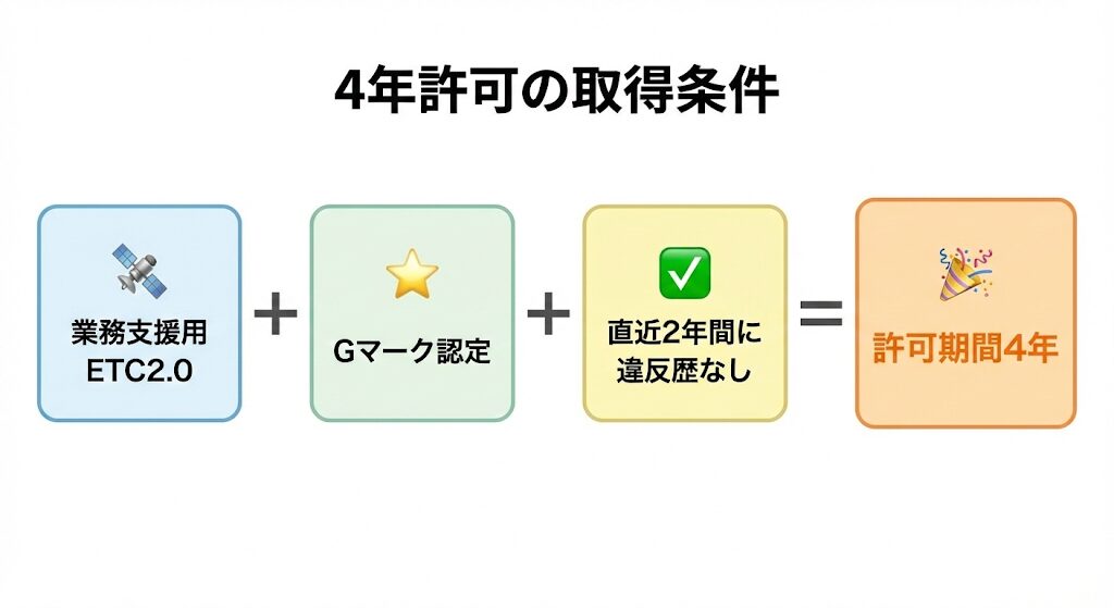 A. いいえ。ETC2.0の登録に加え、申請時に「許可期間を4年とする」旨の選択を行い、Gマーク認定証を添付する必要があります。また、過去2年間に車両の通行禁止などの違反がないことが条件となります。
