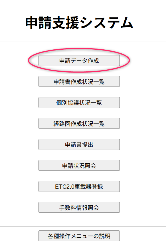 新規申請、更新申請、変更申請のいずれの場合も、画面一番上にある「申請データ作成」ボタンをクリックします。