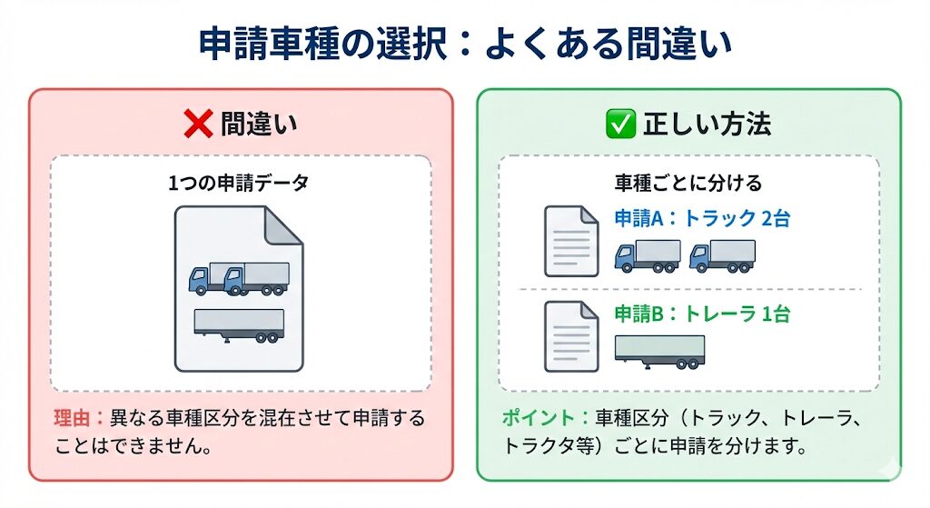 1つの申請データの中に、異なる車種区分(例:「トラック」と「セミトレーラ」)を混在させることはできません。