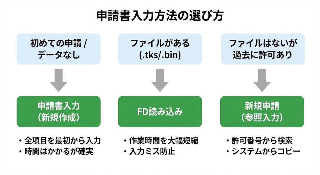 A. 「FD読み込み」はパソコン内のファイルから読み込む方法、「新規申請(参照入力)」はシステムに記録された過去の許可データから読み込む方法です。ファイルがない場合でも、過去に許可を取った実績があれば参照入力が使えます。