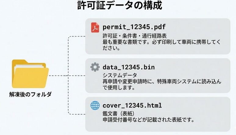 許可証はメール通知後、システムから圧縮ファイル形式でダウンロードします。解凍後のファイルには、PDFファイル(許可証・条件書・通行経路表)、binファイル(システムデータ)、htmlファイル(鑑文書)が含まれています。これらすべてが揃っていることを確認してください。