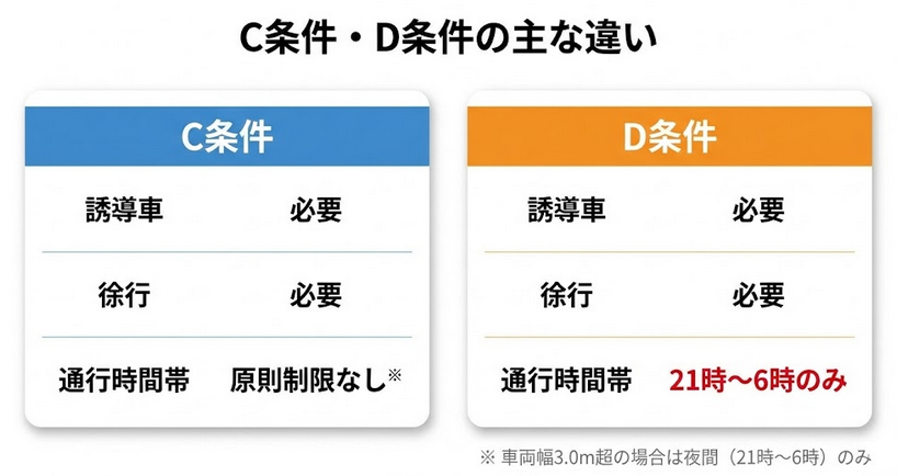 - 走行時間帯の制限: D条件の場合、原則として21時~6時の間しか走行できません。昼間に走ると違反になります