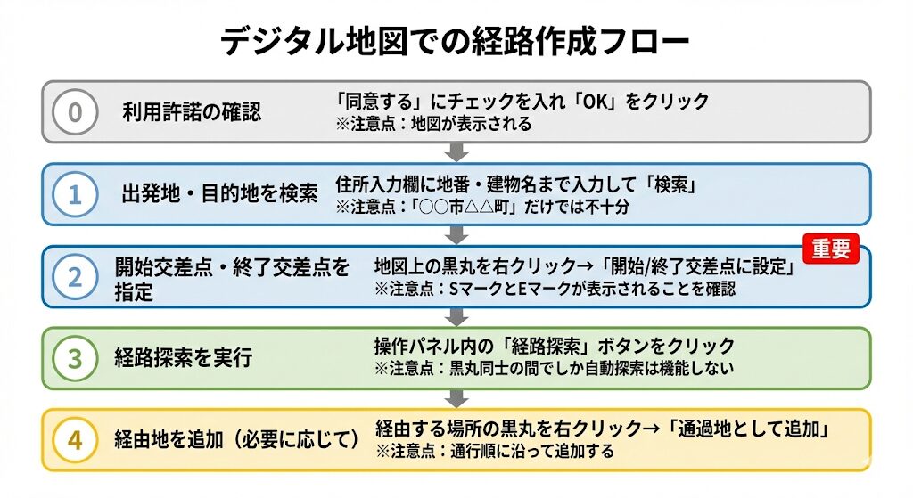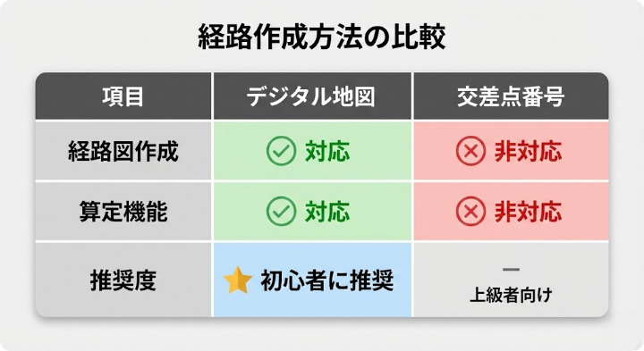 そのため、本記事ではデジタル地図からの入力による経路作成方法を解説します。視覚的にわかりやすく、機能面でも優れているため、初めての方にはデジタル地図での作成を推奨します。