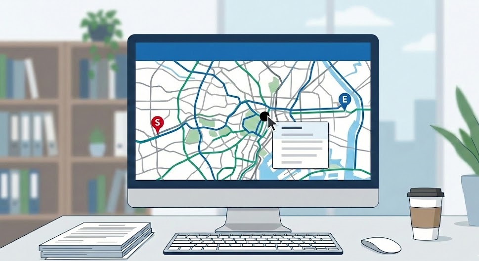 そのため、本記事ではデジタル地図からの入力による経路作成方法を解説します。視覚的にわかりやすく、機能面でも優れているため、初めての方にはデジタル地図での作成を推奨します。