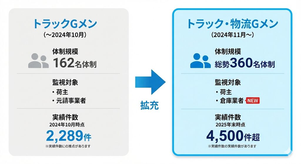 国土交通省の専門部隊「トラックGメン」は、令和6年(2024年)11月に「トラック・物流Gメン」へと組織を再編・拡充しました。総勢360名規模の体制となり、荷主・元請への監視は大幅に強化されています。