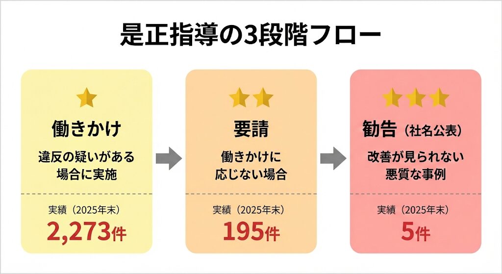 活動は徹底されており、是正指導の件数は「働きかけ」が2,273件、「要請」が195件に上ります。さらに、改善が見られない悪質な事例に対しては、最も重い「勧告(社名公表)」が5件実施されています。