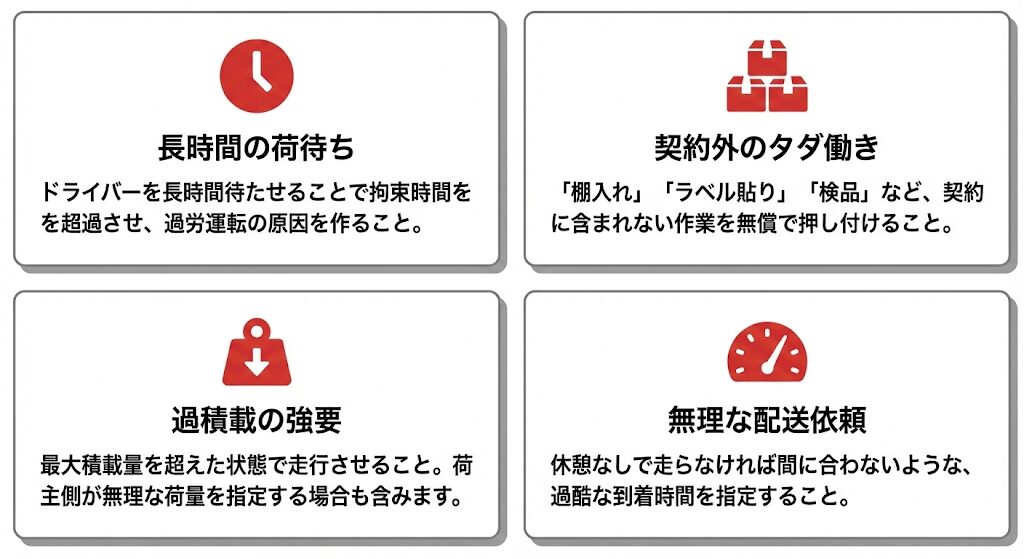 長時間の荷待ち: ドライバーを長時間待たせることで拘束時間を超過させ、過労運転の原因を作ること