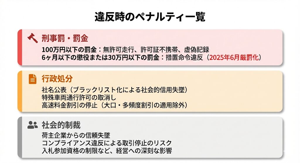 罰金だけでなく、物流事業を継続する上で深刻な影響を及ぼす行政措置が取られます。