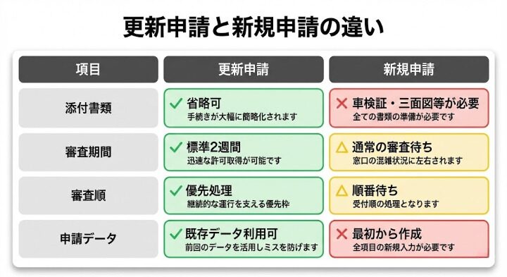これらの変更がある場合は、更新時期であっても変更申請を選択し、期間延長も必要な場合は別途手続きが必要になることがあります。申請区分については、管轄の国道事務所等へ確認することをお勧めします。