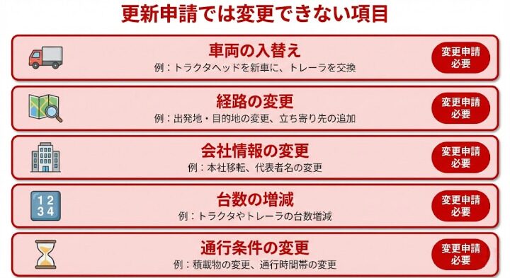 更新申請でよくあるトラブルが、内容変更を含めて更新申請として提出してしまうケースです。特車申請における「更新申請」は、許可内容を変更せずに期間のみを延長する手続きに限定されています。